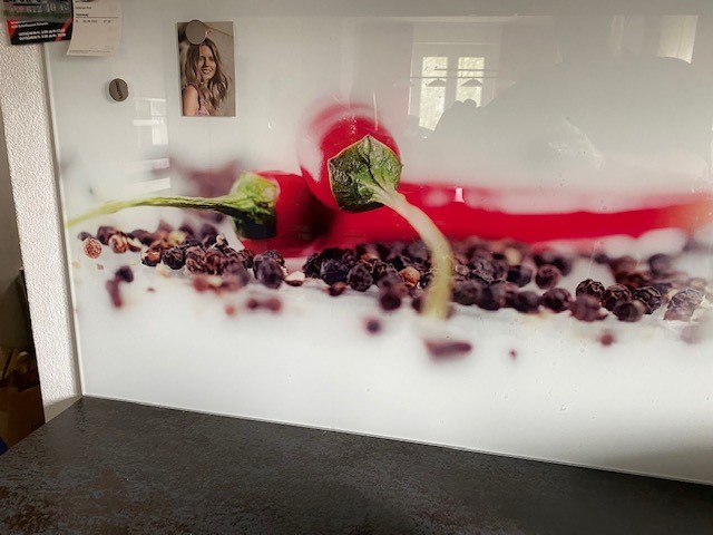 Gaskochfeld kam weg und eine Durchreiche wurde auch noch geplant. Das Spülbecken wurde flächenbündig eingebaut und wie schön, eine farbige magentische Glasrückwand um Notizen zu befestigen wurde auch noch montiert. Arbeitsplatte in Keramik (würde jede Hausfrau/Mann nie wieder hergeben) gehörte natürlich auch dazu.